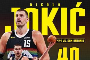 自有失误统计以来,约基奇成为NBA历史首位单场至少拿下40分10助0失误的中锋球员。