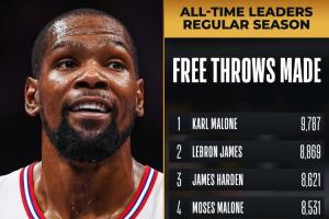 小帅再迎里程碑~杜兰特罚球命中数超大O升历史第6 前面一位是科比