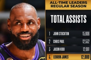 詹姆斯常规赛生涯总助攻数突破12000,NBA历史第四人,仅次于斯托克顿、保罗和基德。