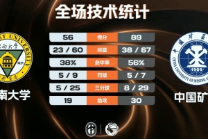 末节中国矿大延续状态,他们开局三个回合全部达成上来就是一波6-1的攻势继续扩大领先,随后东南大学虽然进攻端反扑,但场面优势不大且巨大分差之下难以制造威胁,末段宁吉桐命中三分稳稳保持大比分优势。最终,中国矿大89-56轻取东南大学进入八强。